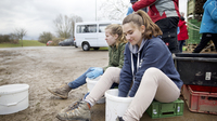 Shane drills the soil probe into the ground. Dennis gives it a forceful whack with the hammer. Yannik scrapes the soil sample and half a worm from the probe. Justin logs the results in a list.
